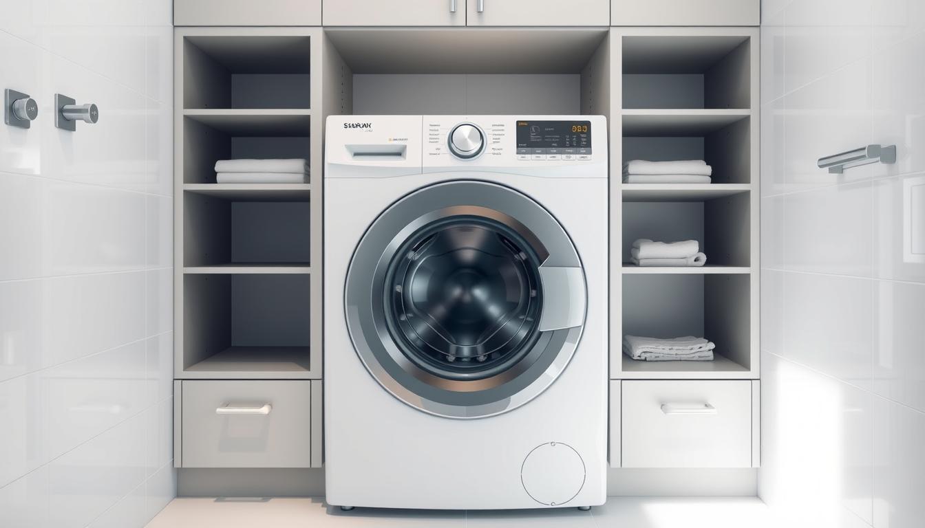 Oberhalb des Geräts entsteht wertvoller Stauraum für Waschmittel oder Textilien. Einbauschränke mit Trockenhalterungen nutzen vertikale Flächen effizient. Professionelle Planung berücksichtigt dabei: